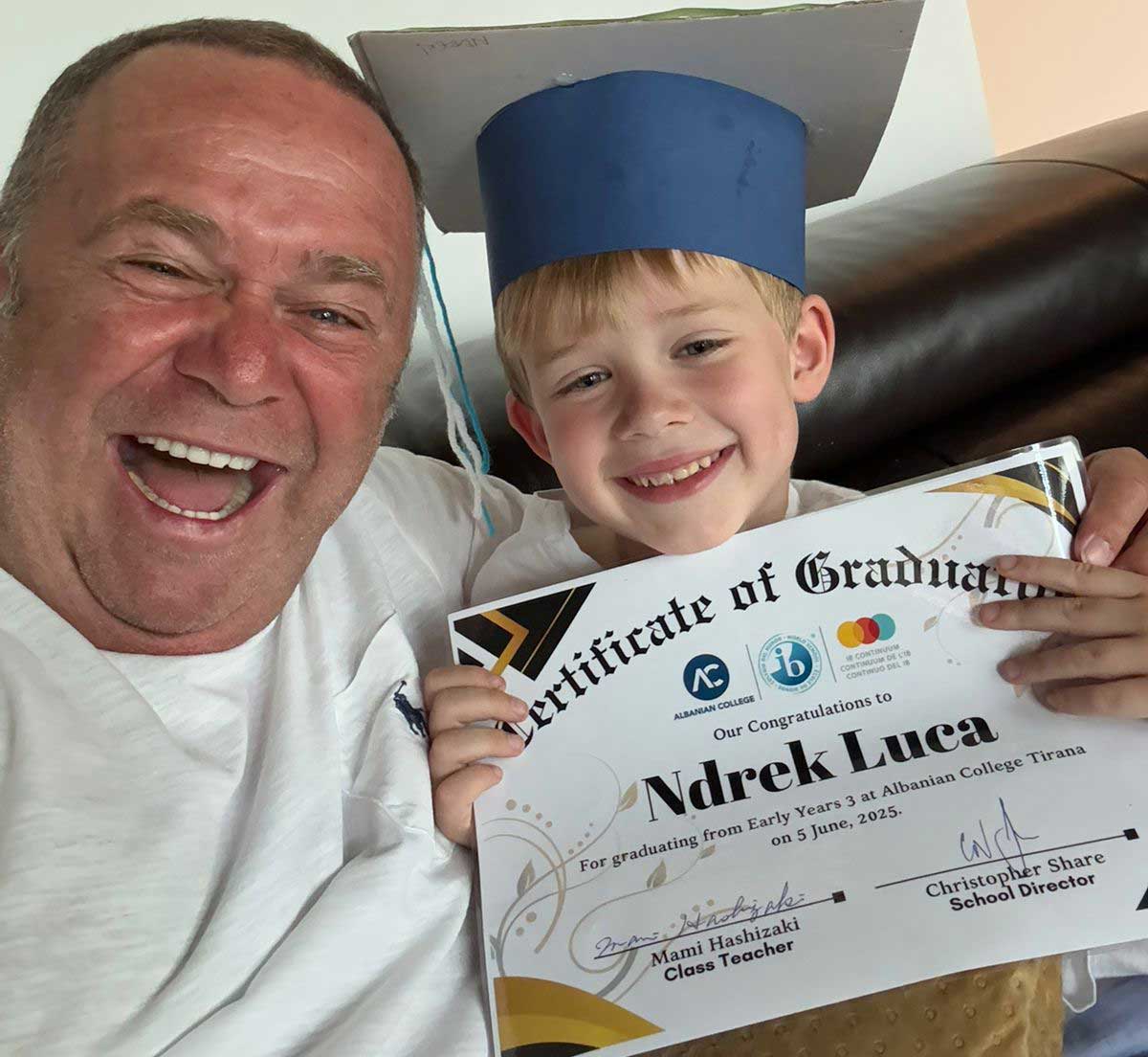 Në një kohë kur rrjetet sociale janë përplot me lajme, opinione dhe imazhe që shpesh kërkojnë të imponohen, ndonjëherë shfaqen pamje që nuk kërkojnë të duken, por vetëm të ndjehen. Një prej tyre është fotografia që sipërmarrësi Gjergj Luca ka ndarë me ndjekësit e tij, një çast intim e prekës, ku shfaqet krahas të birit të tij, Ndrek Luca, në një ditë të shënuar për të dy, diplomimi i vogëlushit nga cikli Early Years 3 në Albanian College Tirana, më 5 qershor 2025.Në këtë fotografi të ngrohtë, Gjergj Luca shfaqet me një buzëqeshje të gjallë, thuajse fëmijërore, ndërsa përqafon të birin që mban krenarisht një certifikatë diplomimi dhe një kapelë të improvizuar, simbol i parë i një rruge të gjatë arsimore që sapo ka nisur. Certifikata është një copëz letre, por me një peshë të madhe emocionale, për fëmijën që ndjen për herë të parë gëzimin e arritjes dhe për prindin që sheh në këtë moment premtimin e një të ardhmeje.“U poq djali, na u bë krah pune!”, shprehet në këtë post, Luca.