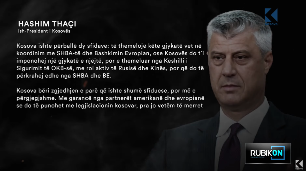 Ish-kryeministri Hashim Thaçi, në intervistën për Rubikon në Klan Kosova ka folur ndër të tjera edhe për themelimin e Gjykatës Speciale. Thaçi që aso kohe ishte zv/kryeministër dhe ministër i Punëve të Jashtme, u shpreh se Kosova ishte përballë dy sfidave, ta themelojë Specialen në koordinim me ShBA-të dhe BE-në ose vendit do t’i imponohej një gjykatë e njëjtë, por me rol aktiv të Rusisë dhe Kinës.