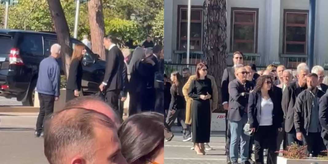 Basha shihet teksa pret në radhë për të kryer homazhe. Ai është i shoqëruar me ish-deputeten e PD-së, Orjola Pampurin.