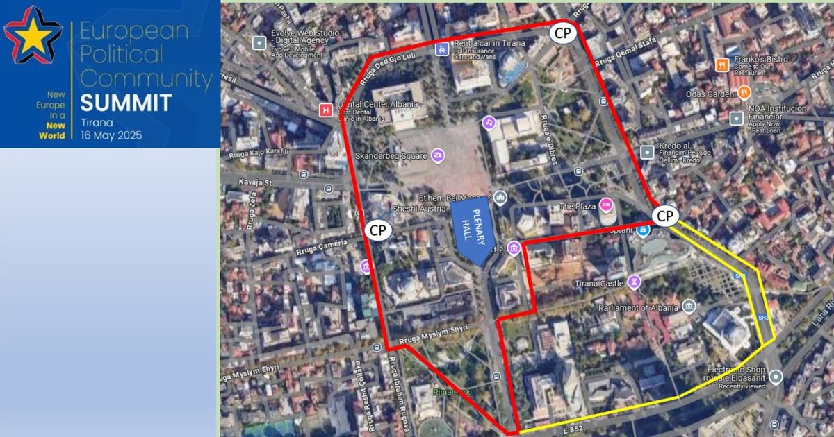 Më datë 15.05.2025, nga ora , do të ketë bllokim të plotë të lëvizjes së automjeteve në intervalin kohor të lëvizjes së delegacioneve në aksin rrugor: “Aeroporti “Nënë Tereza” Rinas – Hyrja te autostrada e re “Thumanë-Kashar” – Autostrada “Durrës-Tiranë” – Mbikalimi i Kasharit – Kryqëzimi tek ish-sheshi “Shqiponja” – Unaza e Re krahu i Astirit – Kryqëzimi te “Pallati me shigjeta” – Rrethrrotullimi i Saukut të vjetër – Rruga e Elbasanit – Hotel “Plaza” – Rruga “George ë. Bush” – Rruga “28 Nëntori” – Rruga e Dibrës – Rruga “Urani Pano”- Sheshi “Skënderbej” (vendi i aktivitetit).”
