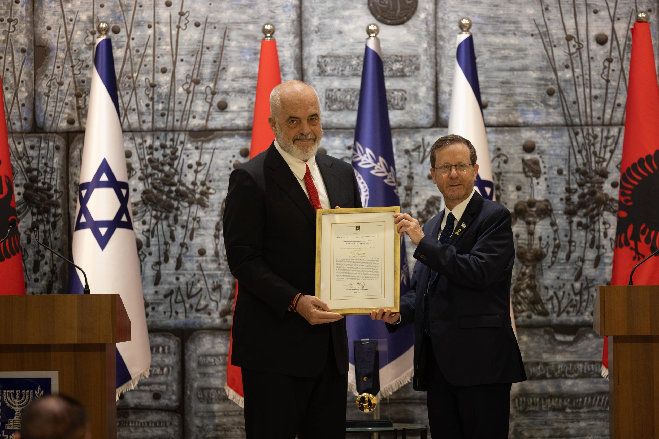 Kryeministri i vendit, Edi Rama është nderuar me Medaljen Presidenciale të Nderit akorduar nga Presidenti i Izraelit, Isaac Herzog.